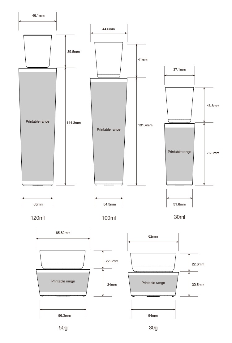 A: This series includes multiple sizes: 120ml, 100ml, 30ml, 50g, and 30g, suitable for different product types such as liquids, gels, and creams.