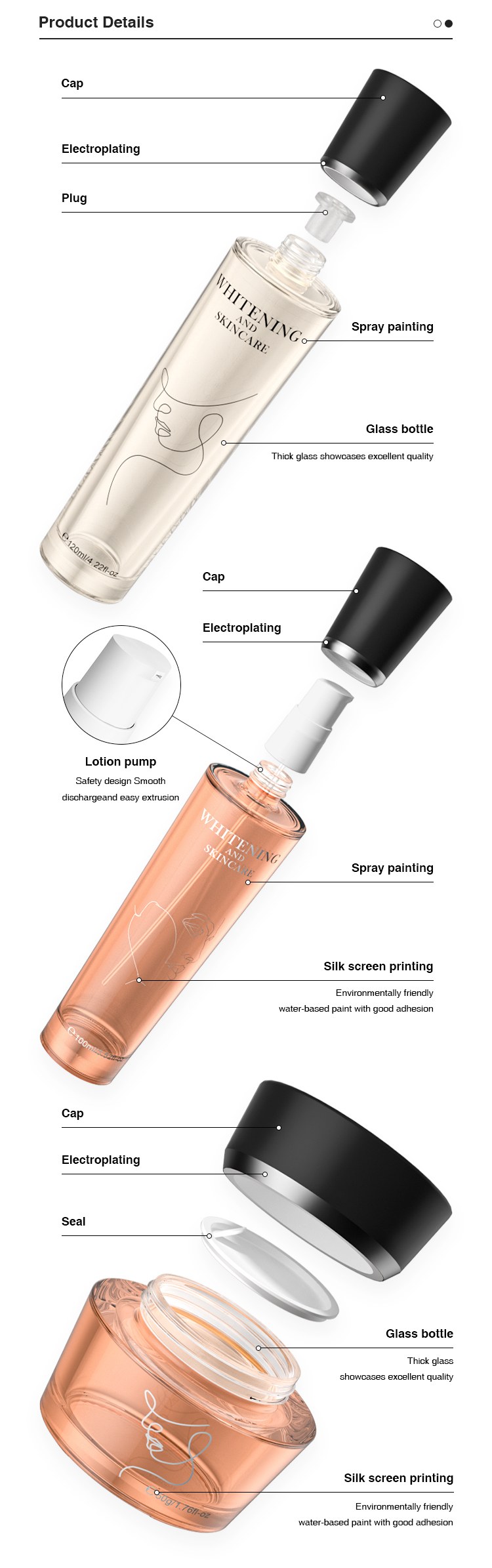 Spray Painting / ElectroplatingThe Translucent cosmetic glass bottle packaging series is designed to elevate skincare and beauty presentation with refined simplicity and premium functionality. Available in 120ml, 100ml, 30ml, 50g, and 30g sizes, this versatile collection meets the diverse needs of cosmetic brands for toners, lotions, serums, essential oils, and creams. Each bottle features a soft translucent finish that combines elegance with practicality — allowing consumers to view the product inside while maintaining a sophisticated aesthetic.