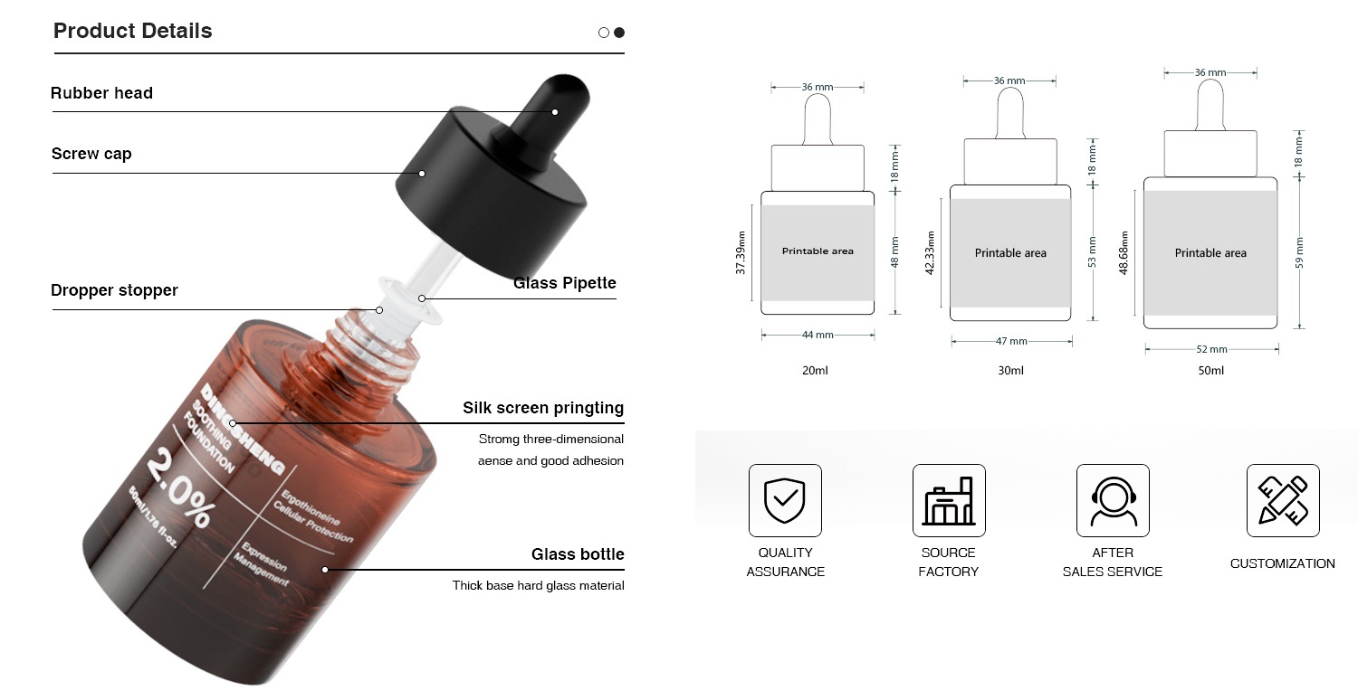 This premium Cylindrical Amber Glass Dropper Bottle features a thick base for a luxury weighted feel and deep amber glass for superior UV protection of light-sensitive serums and foundations. Available in 20ml, 30ml, and 50ml, the design includes a clean-dispensing dropper stopper and supports full OEM customization—from 3D silk screen printing to custom color matching—to elevate your brand’s professional packaging.