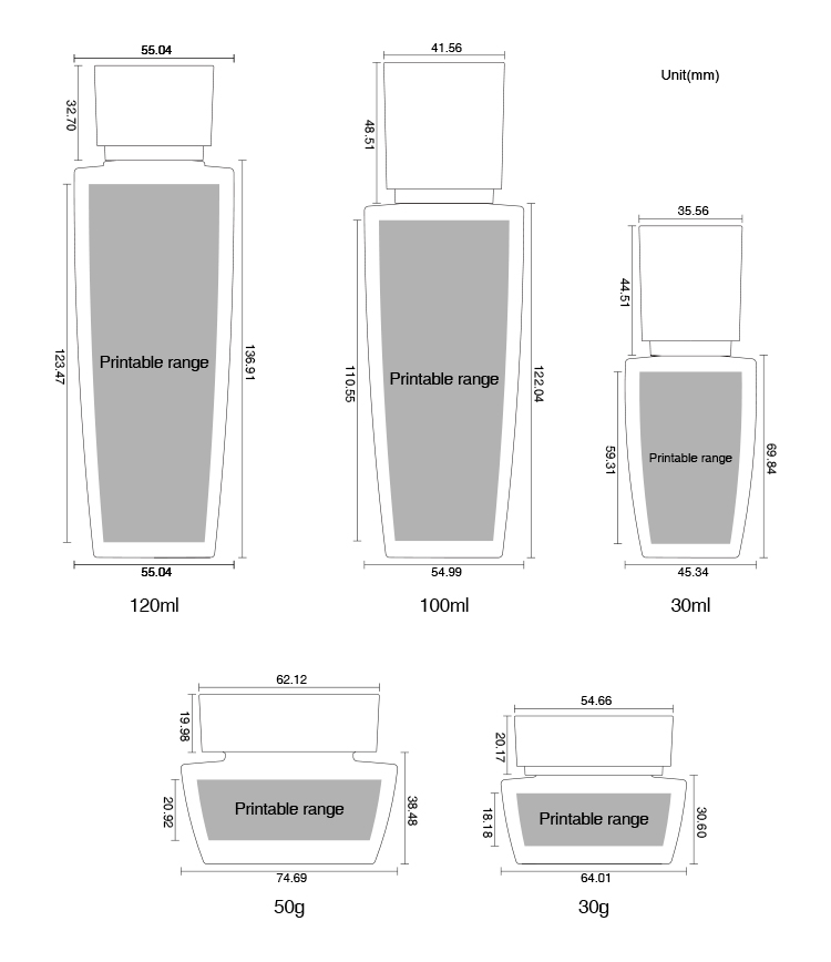 | Capacity Options | Glass Bottles: 120ml / 100ml / 30mlGlass Jars: 50g / 30g |