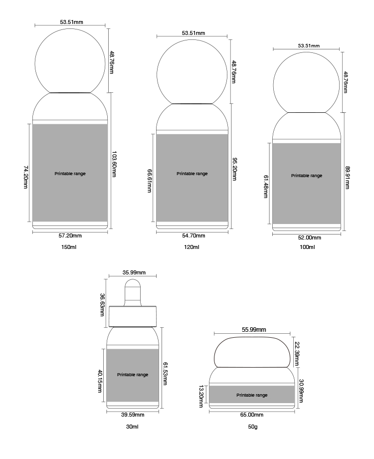 | Volume | Bottles: 150ml / 120ml / 100ml / 30ml Jars: 50g |
